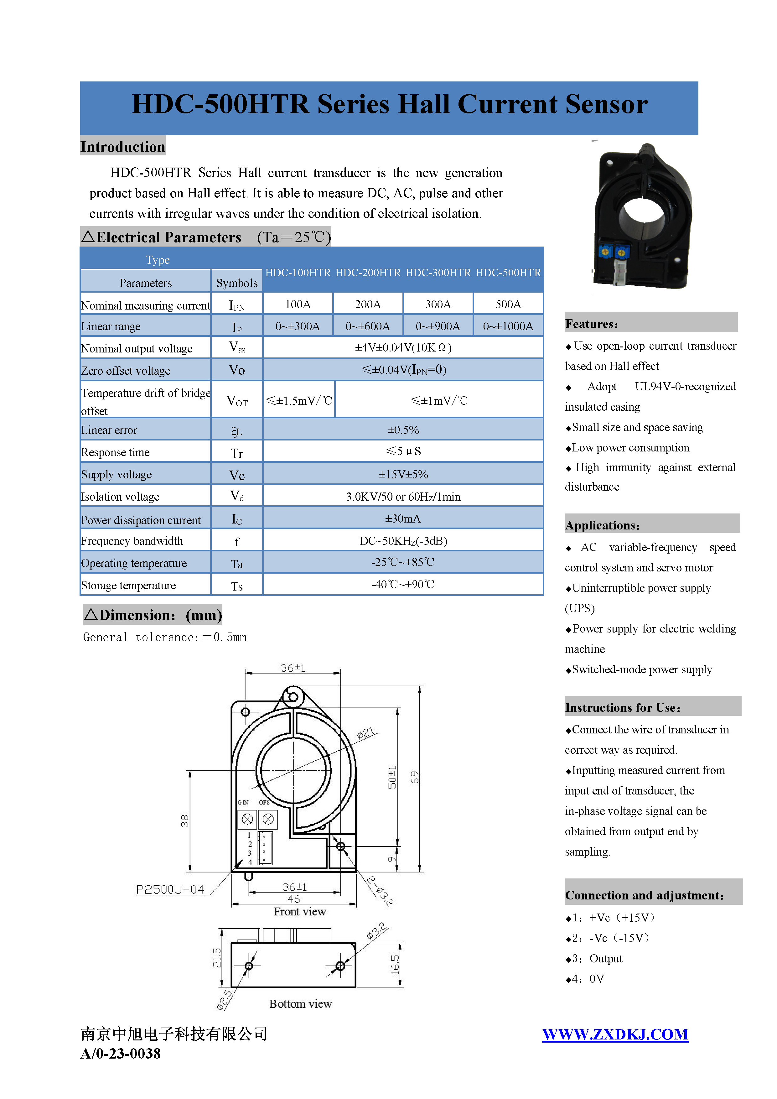 HDC-500HTR系列霍爾電流傳感器是應用霍爾效應原理的新一代電流傳感器,能在電隔離條件下測量直流、交流、脈沖以及各種不規則波形的電流。
